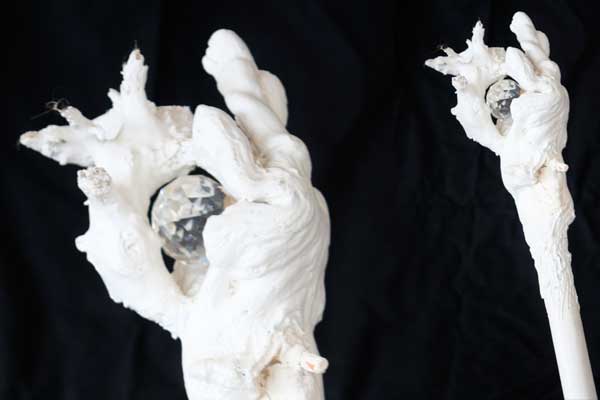 Materials: wood, hot glue, resin Comment; The staff has been wired to light up the crystal with a light-switch.