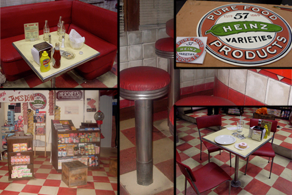Comment; Stool tops made from plywood and upholstery materials. Diner seating converted from two separate pieces into corner seat and diner-chairs reupholstered. Tables made from wood with metal bases. Dime store counters made from plywood. Doughnuts and lollipop stand also made by Lo Wipp.